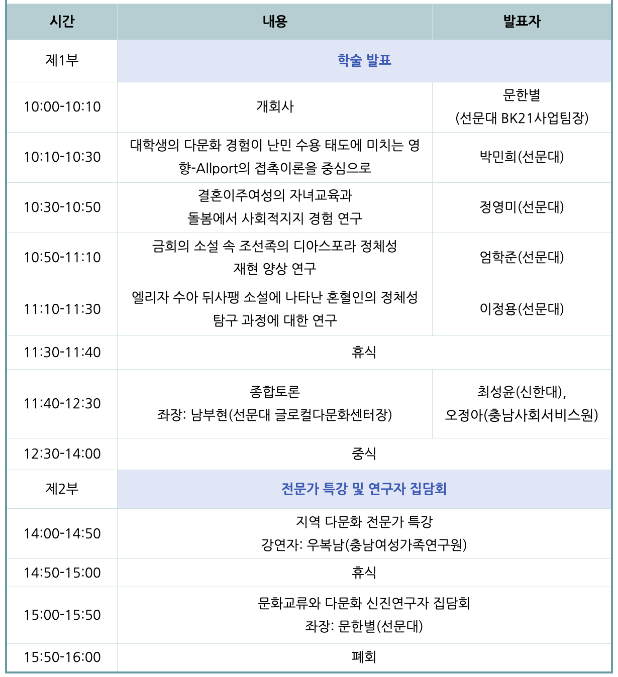 - 주제: 다문화 사회의 정착과 소통을 위한 문화교류의 활성화 방안
